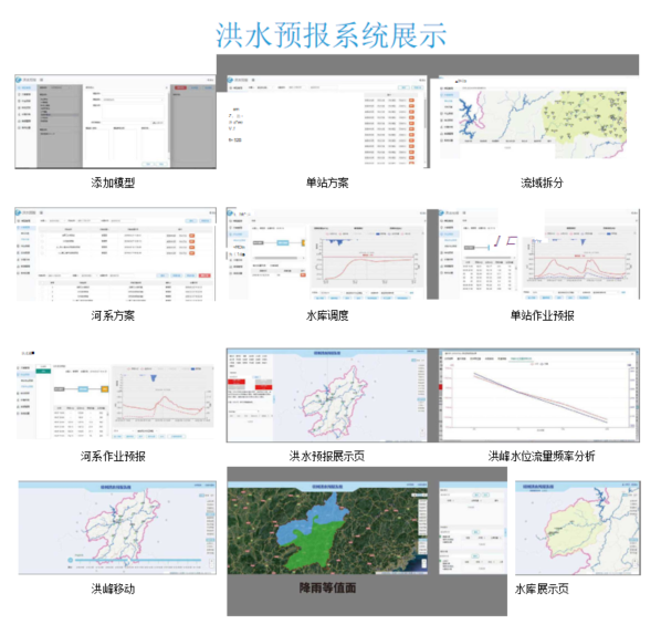 系统具有开放性的水文模型库,系统目前集合了常见的水文预报模型(新安江、API、集合单 位线、水箱模型、马斯京根、滞后演算法等),用户可自由导入、导出系统水文模型,并运用相 应的水文模型进行洪水预报。系统采用开放性的构架,分布式计算的服务流程,能自动预报各个断面的水位流量,并发布。能对各流域测站的降雨、水位、流量、预报等进行展示,对测站基本水情信息进行查询,对越限、超标洪水等进行预警。各预报模型的适应性较强,各断面的预报精度能达到甲级作业水平。